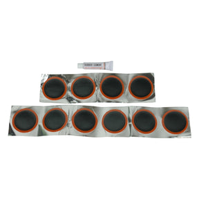 The 11-piece 50mm Cold Patch Tube Repair Kit comes with 10 cold patches that consists of a semi-vulcanized layer and vulcanized reinforced layer. Cold Patches are heat resistant and can be used to repair the inner tyres of bikes, motorcycles, ride-ons and ATV's as well as for natural/synthetic rubber tires. Clean and buff injured area and then apply the patch securing it with the rubber cement.
