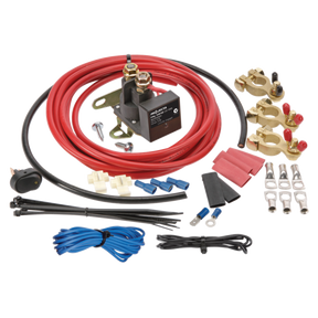 Kit comprises: 100A voltage sensitive relay (P/No. VSR100), rocker switch, lugs, terminals, heat shrink & cable ties, 4m main cable & 60cm aux earth cable (6 B&S), auxiliary battery terminals (2 x positive, 1 x negative)